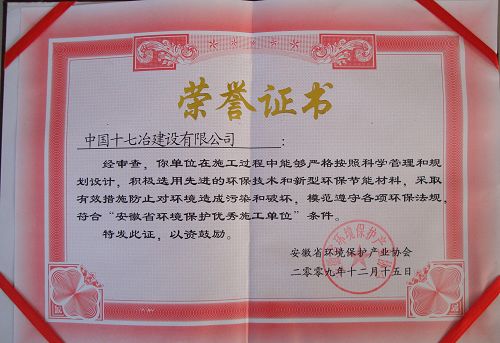日前,安徽省环保局产业协会对我公司2009年度的环境保护工作进行了评估,经审查授予我公司“安徽省环境保护优秀施工单位”的荣誉称号,并颁发了荣誉证书和奖牌。