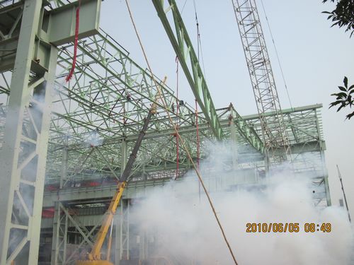 65上午8:48分,十七冶山东巨能特钢钢结构工程最后一片跨长达三十九米的屋架在大型吊机的轰鸣声被徐徐吊起,在施工人员的精心操作下,准确就位。下午,屋面彩板也顺利安装就位,一天内实现了两大节点,受到业主和在巨能特钢施工同行们的一致好评,为下道工序设备安装奠定了坚实的基础。