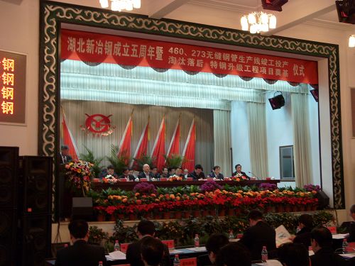 1211上午,湖北新冶钢成立五周年暨460、“273无缝钢管项目竣工庆典仪式隆重举行,湖北省副省长田承忠、中信泰富董事局主席常振明、黄石市委书记王建鸣、市长杨晓波与新冶钢总经理钱刚等出席了庆典大会,十七冶副总经理彭毅忠参加了庆典仪式。
