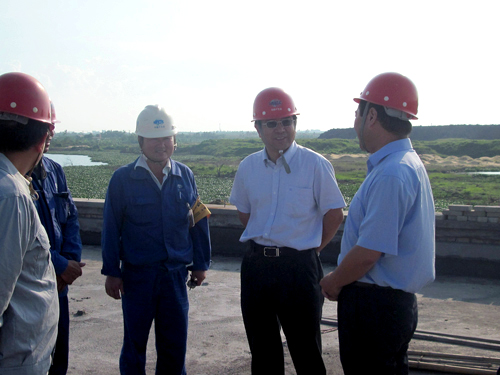 917,十七冶集团公司董事长康承业在湛江分公司经理正清的陪同下,视察了湛江钢铁项目场平四标和南排洪沟工程。