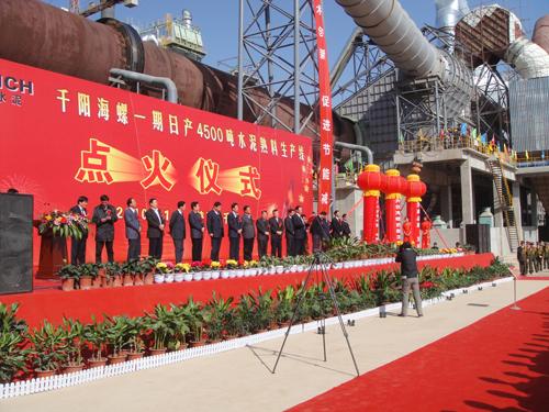 11月8日上午10时,由水泥工程技术公司承建的宝鸡市千阳县海螺一期4500t/d熟料水泥生产线顺利点火投产,陕西省人大常委会原代主任崔林涛、省政协副主席张生朝、宝鸡市市委副书记戴征社、陕甘区主任陈永波、海螺集团副董事长李顺安、千阳海螺总经理兰泽军等领导出席点火仪式,十七冶水泥工程技术公司副经理胡文奎参加了典礼。