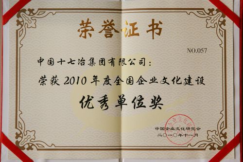 11月13日至15日,中国企业文化研究会以新中国60年企业精神传承与创新为主题的中外企业文化2010北京峰会隆重举行,中国十七冶集团荣获“全国企业文化建设优秀单位”称号。全国人大常委会原副委员长何鲁丽、成思危、许嘉璐、蒋正华出席会议并作论坛主旨发言。600多位来自国有大中型企业和知名民营企业的负责人参加了会议。