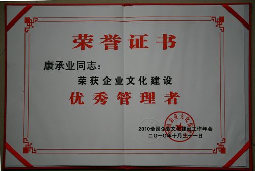 1031,中国企业文化促进会2010全国企业文化建设工作年会在北京人民大会堂隆重召开。会上,中国十七冶集团有限公司被授予企业文化建设“百家重诚信单位”称号,康承业同志被授予企业文化建设“优秀管理者”称号。