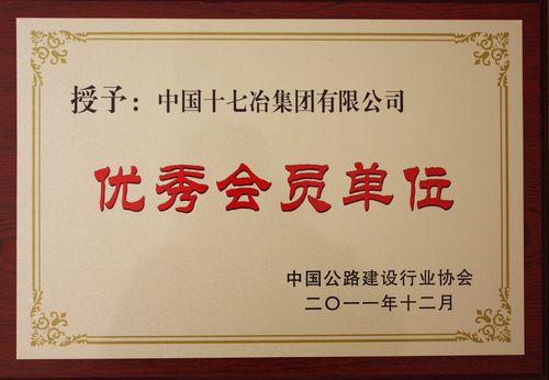 1210,在北京召开的中国公路建设行业协会第三届代表大会上,中国十七冶集团有限公司被授予“百家优秀会员单位”荣誉称号。这是中冶集团内部唯一获得此表彰的单位。