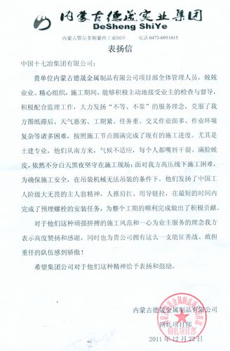 近日,内蒙古德晟实业集团发来热情洋溢的表扬信,对中国十七冶集团内蒙古德晟项目部全体管理人员在施工生产中所展现出的十七冶人不等、不靠、不畏艰苦、特别能战斗的精神表示高度赞扬。