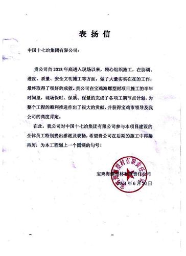 近日,中国十七冶集团收到了宝鸡海螺型材有限责任公司发来的表扬信,表扬城建工程技术公司宝鸡海螺型材一期工程项目部为工程建设顺利推进所作出的积极贡献。