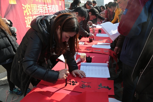 210下午,马鞍山市工人文化宫、市书法家协会、中冶置业(安徽)公司联合举办的“2015年书赠春联、赠书活动”在金福花园二期项目举行。市书法家协会主席袁诚等五位知名书法家现场挥毫泼墨,为即将回家过春节的农民工兄弟送上浓浓的年味和祝福。马鞍山电视台的记者还到现场对活动进行了采访。