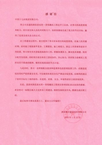 122,泗县城市投资建设有限公司向中国十七冶集团发来感谢信,对中国十七冶集团南京分公司泗县清水湾景苑棚改项目一年以来的工作表示肯定和衷心的感谢。