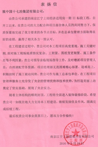 518日,南京上坊建设开发有限公司向中国十七冶集团发来表扬信,表扬十七冶南京分公司在上坊片区经济适用房一期II标段的施工中奋勇争先,保质保量完成了各节点目标,并在管理方面取得了良好业绩。