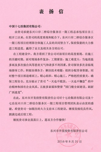 831日,东兴市开发投资有限责任公司向中国十七冶集团致表扬信,对十七冶东兴国门工程项目管理团队表示感谢,盛赞十七冶在国门工程建设中高效务实的作风,创造了“国门速度”。