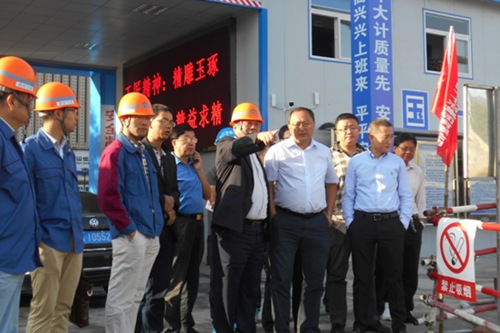 魏肖克董事长一行实地查看工地现场,详细询问工程质量、安全、进度等情况并对项目部卓有成效的工作给予了充分肯定。在随后召开的项目部座谈会上,魏肖克董事长听取政府及相关职能部门的情况介绍,并就工程建设质量的监管和工期进度等事项同与会人员进行了深入探讨和交流。