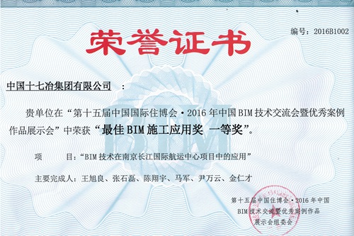 1015号,由中国建造师联盟主办的第十五届中国住博会·2016年中国BIM技术交流暨优秀案例作品展示会大赛在京召开,中国十七冶集团报送的“BIM技术在南京长江国际航运中心项目中的应用”项目荣获“最佳BIM施工应用奖一等奖”。