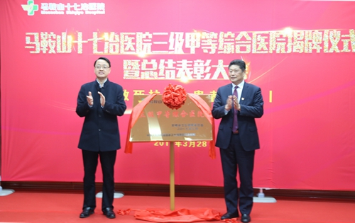 328日上午,十七冶医院举行三级甲等综合医院揭牌仪式暨总结表彰大会。马鞍山市副市长杨善斌,中国十七冶集团董事长、党委书记喻世功共同为马鞍山十七冶医院三级甲等综合医院揭牌。马鞍山市卫健委党委委员、副主任邓国支宣读了安徽省卫健委关于马鞍山十七冶医院三级甲等综合医院的批复。