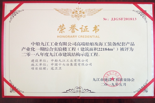 614日,中国十七冶集团江西分公司承建的中船九江高端船舶及海工装备配套产品产业化一期综合实验楼项目荣获九江市“2018年度建筑结构示范工程”称号。