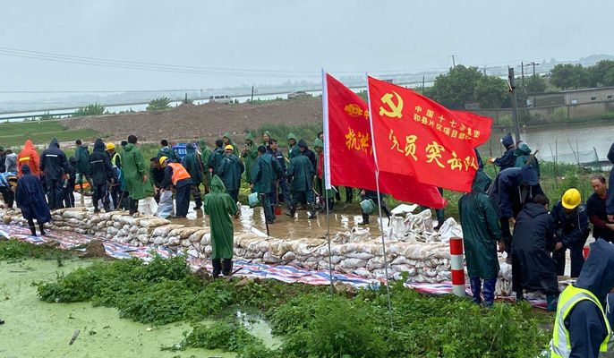 7月15日以来,和县裕溪河裕溪闸水位持续上涨,最高值超警戒水位1.54米,加上特殊的地理位势,和县防汛抗洪形势异常严峻。中国十七冶集团和县片区项目部迅速成立抗洪抢险党员突击队,当天即组织人员参加长江江堤乌江段巡堤,主动担当起县区抢险攻坚队任务。