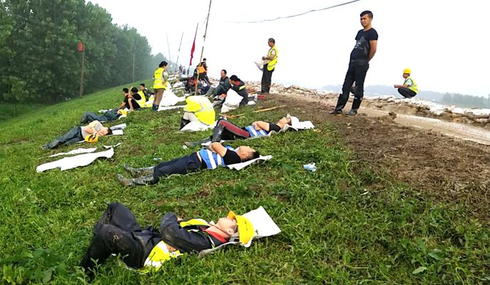 经过连续两天抢险,此时所有人的体力都受到了很大程度的损耗。正准备回到大本营小作休息的突击队员们,在返程途中接通知转战黄坝大堤加高加固河堤,至夜间12点半返回驻地。