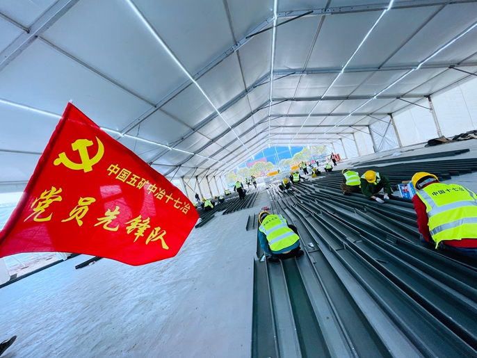 为进一步凝聚攻坚克难的澎湃力量,公司党委积极开展“党旗飘扬、党徽闪光”行动,援建工作组选派党员骨干,在现场组成7个党员突击队、1个党员先锋岗、1个青年突击队,担纲急难险重任务,加强组织调度,倒排工期,编制“小时制”作战地图。以日夜班模式保持24小时连续施工,每日早上制订当日工作计划并安排实施;晚上召开总结会,对施工进度和工作问题进行梳理并解决。全面对接中国五矿和中冶上海防疫指挥部,同时和中冶在沪子企业协同配合,主动“补位”推进建设;坚持施工生产和疫情防控两手抓两不误,先抗原后核酸,做到全员一日两测,严防死守疫情的发生。
