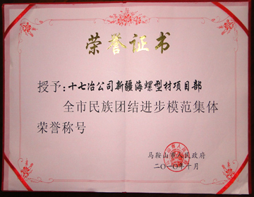 1021,马鞍山市人民政府对全市民族团结进步模范集体和模范个人进行表彰,城建工程技术公司新疆海螺型材项目部荣获模范集体称号,十七冶集团公司人力资源部王年松荣获模范个人称号。