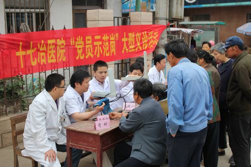 “党员示范岗”义诊活动是该院庆祝建党90周年系列活动之一。当天一大早,十七冶医院口腔科、普外科、骨科、眼科、泌尿科、乳腺科、妇产科等10多位党员医疗专家放弃休息日,来到当涂县江心乡,在乡政府门前开展“党员示范岗”义诊活动。江心乡的父老乡亲们排着长队向医疗专家们求医问诊。即便中途下起了细雨,专家们依然冒雨为患者看病。