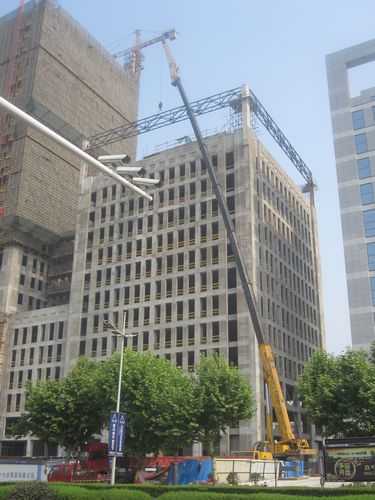 金融中心ABC三栋塔楼钢结构共120吨,高度分别达到了109.6m109.6m57.6m屋顶面钢结构安装技术、安全要求高。在最先进行的C楼钢结构安装过程中,东、北、南三面使用300吨的汽车吊将钢桁架吊至楼顶,而西边则使用塔吊将钢构件吊至楼顶,然后再进行组装,高强螺栓连接。安装中,还对钢梁与柱头连接处的焊缝进行了探伤检测。
