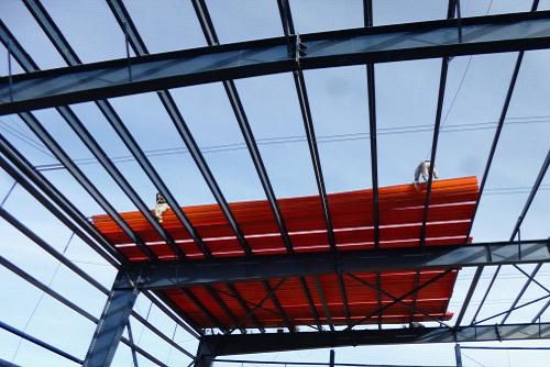 1117上午,由达成公司轻钢结构厂承建的湖金属镁项目厂房防腐板开始安装