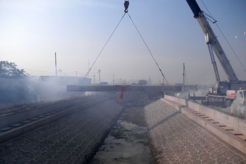 南京燕山路天保西河桥首片空心板梁成功吊装