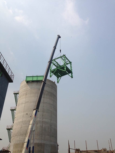 该仓顶钢结构转运站位于仓顶平台上部,转运站外形尺寸为16m*7.5m*9.325m,底部标高+36.5m,共分为两层,第一层为K112胶带机机头设备安装平台,标高+39.97m,第二层屋面结构标高+45.825m,现场组装成框架结构,单吊起吊重量约33t。为保证大件吊装工期,争取超高空作业在青奥会前顺利完成,项目部和机装一处根据既定节点计划,争分夺秒顺利完成仓顶转运站组装工作,这是继筒仓仓顶平台顺利吊装后的又一个重要节点,为后续K112通廊全线贯通以及短流程电缆敷设创造了有利条件。