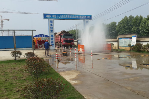 土方施工期间,项目部安排保洁队伍清理抛洒落土,配备洒水车冲洗出土道路。在现场安装洗车台,坚持所有出场车辆执行冲洗制度,同时配备高压清洗机冲洗土方车轮胎。对场内裸露土方和易起尘物料进行全覆盖,并在场内硬化道路设置自动喷淋系统进行降尘,对场外的裸露地面铺设草皮,进行绿化。