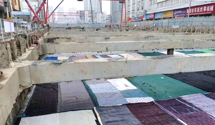 “这是什么?是调色板吗?”远远望去,冬季的河南南阳火车站广场项目,一块块红的、绿的、黄的、蓝的、白的长方形练成一片,犹如五彩的田地,在基坑下5米的地方格外显眼。原来,它们就是铺在刚浇筑完混凝土顶板上的一条条彩色的棉被,它们给这寒冷的工地带来一个美丽的温度。