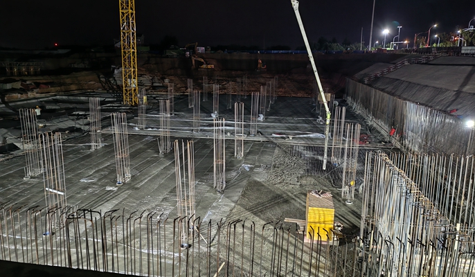 浇筑过程中,项目部结合现场实际,优化施工方案,科学配置资源,对现场作业人员进行针对性技术质量、安全交底。采用62米泵+56米泵两台泵车同时作业进行浇筑,项目部技术和安全管理人员全程跟踪混凝土浇筑情况,确保浇筑质量及安全,并要求商砼供应站安排专人紧密跟踪,对商砼运输车辆实时进行调度,确保浇筑过程商砼供应不间断,保证了筏板浇筑质量,为接下来工程的平稳推进,打下了基础。
