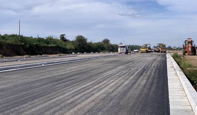 三门峡崤函大道项目主线沥青下面层试验段开始摊铺