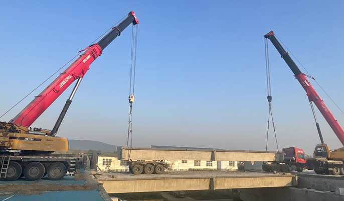 姚站岗南水北调特大桥全桥由主桥(跨南水北调总干渠)及引桥组成。桥梁主桥布置为85+155+85米矮塔斜拉桥,结构正交,与主桥相接的北引桥为一孔简支装配式小箱梁,跨径为25米,共计12片梁。根据单片箱梁的最大重量和现场场地实际,箱梁架设按施工方案采用两台100吨的吊车在箱梁两端同时起吊进行安装。架设前,项目工程部和安全部对施工管理人员及作业人员进行安全技术交底,提前掌握施工控制关键点。架设中,技术人员通过全站仪严控每片箱梁的落位,保证支座安装水平度和箱梁安装位置符合设计要求。架梁施工区域设置安全警戒和交通导向标志,并由安全员全程盯控,确保架梁过程安全。