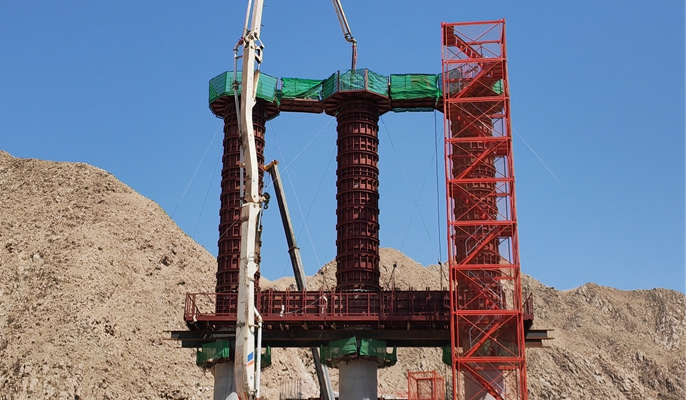 项目位于甘肃省皋兰县及榆中县交界处,由南向北建设大河坪隧道、什川黄河特大桥、上河坪隧道、上河坪大桥等。上河坪大桥为连接上河坪隧道出口及下河坪隧道进口而设,桥梁左幅长度665米,右幅长度750米。桥跨布置为左幅6×50米(波形钢腹板-混凝土组合梁)+12×30米(装配式预应力混凝土连续箱梁);右幅6×50米(波形钢腹板-混凝土组合梁)+15×30米(装配式预应力混凝土连续箱梁)。本桥下部结构桥墩采用柱式墩、桩柱一体墩、箱型墩和空心薄壁墩,桥台采用柱式台,基础均为端承桩,全桥桩基共计206根。此次浇筑的3根墩柱位于大桥左幅13#墩桩,为直径1.8米圆墩柱,单根柱高31米,中间设计柱系梁两道。