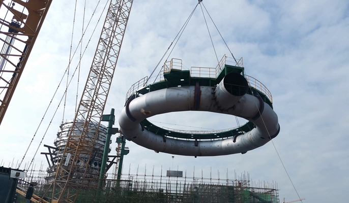 云南楚雄钢铁项目包括上料系统、炉体系统、炉顶系统、风口平台及出铁场系统、干法除尘系统、粗煤气系统、热风炉系统、炉渣处理系统及水渣转运、出铁场及炉顶除尘系统、中控楼的建安工程。热风围管是该项目热风管道补偿装置,用于解决现有的补偿装置和方法均无法实现的热风总管与热风围管不在同一高度的热风管道补偿问题。高炉热风围管由于直径大,重量重,高度高,且受现场场地影响,吊装空间较小,因此,吊装难度较大。此次高炉热风围管吊装成功,是云南楚雄钢铁项目的全新阶段和重要节点。