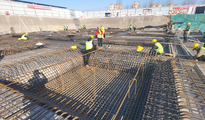 元旦以来,项目团队以“开年即开跑,起步就冲刺”的姿态,倒排工期、挂图作战,科学制订施工计划,精心布置施工任务,合理优化资源配置,在确保安全质量的前提下,抢抓一切可用时间加快推进建设。截至目前,项目地下室底板防水、保护层浇筑完工;裙楼筏板、下柱墩、集水井钢筋绑扎完成;裙楼1-8轴交G-J轴地下车库框架柱和剪力墙基层插筋预埋、安装绑扎完成,基础筏板支模作业、基础接地与止水钢板的焊接作业完成。