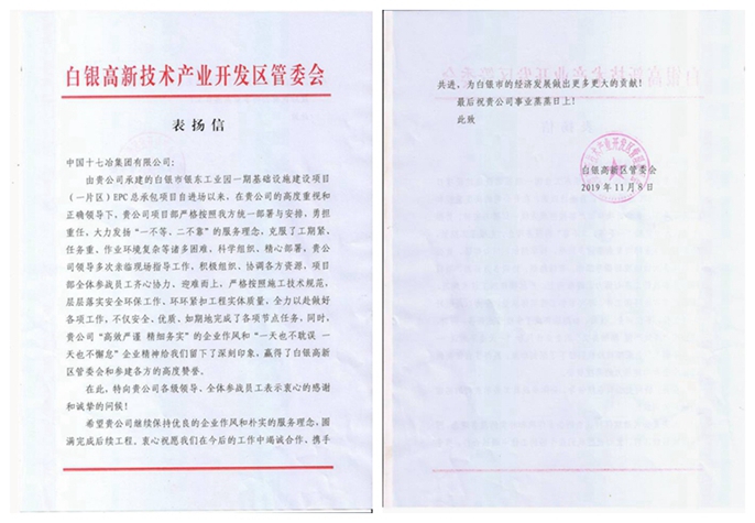 白银高新区管委会向十七冶致表扬信