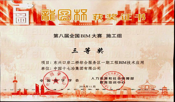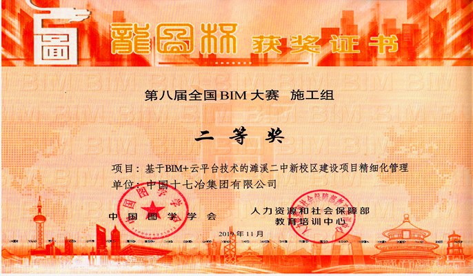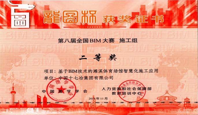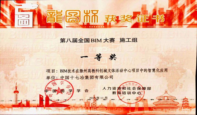 11月21日,在2019年第八届“龙图杯”全国BIM颁奖会上,中国十七冶申报的“BIM技术在滁州高教科创城文体活动中心项目中的智慧化应用”、“基于BIM+云平台技术的濉溪二中新校区建设项目精细化管理”、“基于BIM技术的濉溪体育场馆智慧化施工应用”、“东兴口岸二桥综合服务区一期工程BIM技术应用”两项作品经过初评、复评、终评答辩在1844项作品中脱颖而出,分别荣获施工组一、二、三等奖。