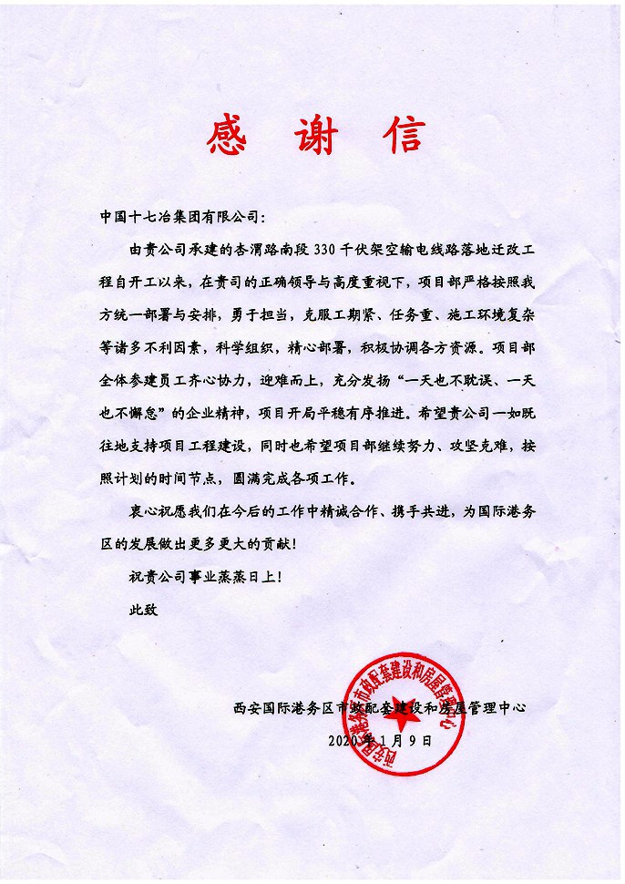 1月9日,中国十七冶集团收到西安国际港务区市政配套建设和房屋管理中心发来的感谢信,对路桥工程技术分公司承建的西安东北部330KV架空线路落地迁改电缆工程杏渭路(北三环-潘骞路)电缆隧道工程取得的进展表示衷心感谢。