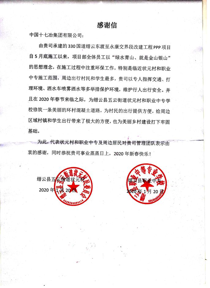 1月20日,缙云县五云街道状元村民委员会、职业中等专业学校向中国十七冶集团有限公司发来感谢信,感谢路桥工程技术分公司330国道缙云东渡至永康交界段改建工程PPP项目部为状元村和职业中等专业学校修筑了一条美丽的环村混凝土道路,为村民和学生的出行提供了极大的便利。