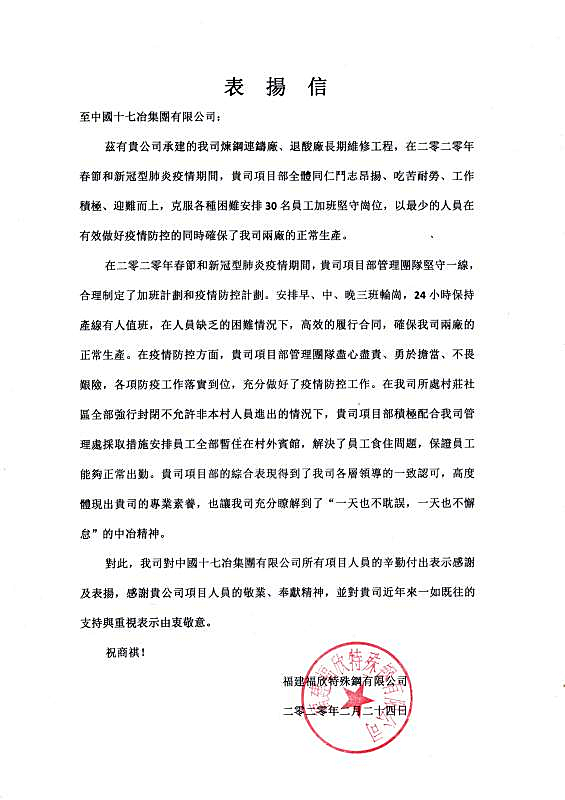 2月24日,福建福欣特殊钢有限公司向中国十七冶集团发来表扬信,对冶金工程技术分公司承建的福建检修项目在2020年春节和新冠肺炎疫情期间有效做好疫情防控的同时顺利确保公司两厂生产工作予以高度赞扬,并对项目团队全体人员的辛勤付出给予充分肯定和认可。