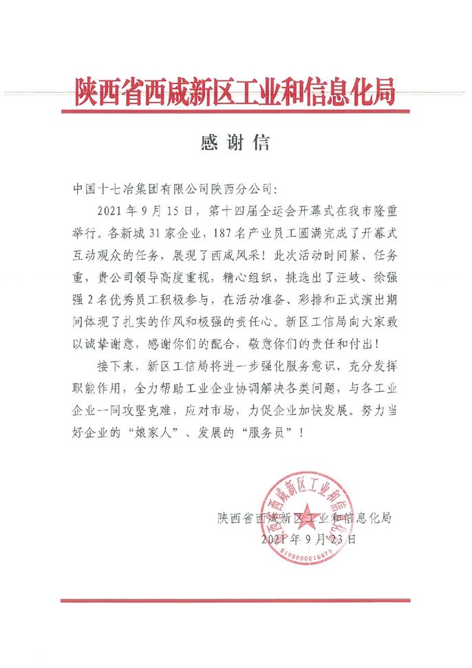 9月23日,陕西省西咸新区工业和信息化局向中国十七冶集团发来一封感谢信,对陕西分公司汪岐、徐强强等2名职工在第十四届全国运动会中的积极参与和热情服务表示感谢。
