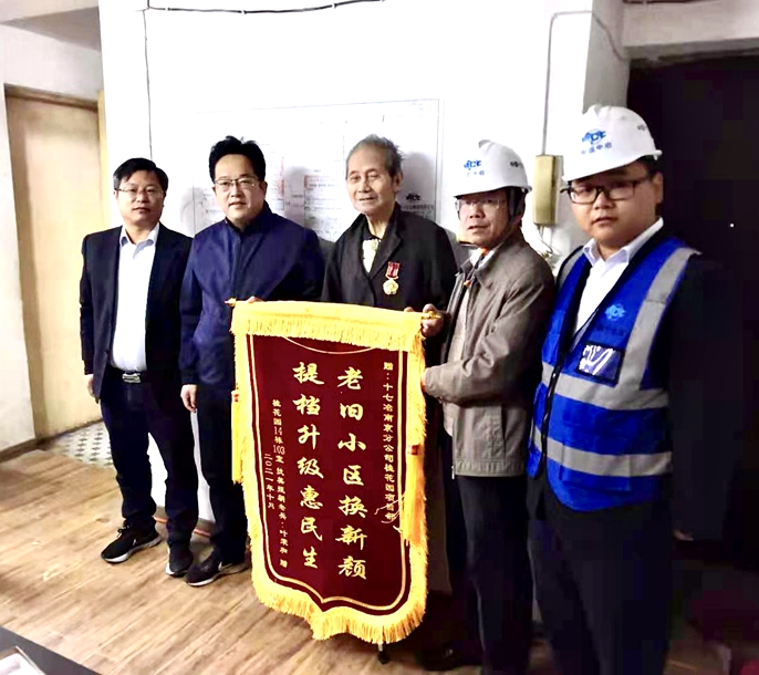 10月17日下午,中国十七冶南京分公司马鞍山花山区老旧小区改造项目部迎来一位九旬老人,老人亲手给项目部递上了一份特殊的礼物,一面写有“老旧小区换新颜,提档升级惠民生”的锦旗。