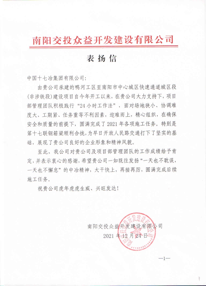 12月24日,南阳交投众益开发建设有限公司向中国十七冶集团致表扬信,对中国十七冶集团路桥工程技术分公司承建的鸭河工区至南阳市中心城区快速通道城区段(非涉铁段)建设项目迎难而上、圆满完成2021年各项施工任务提出表扬并表示感谢。