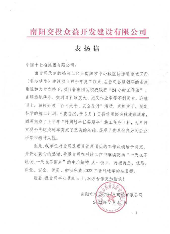 7月13日,南阳交投众益开发建设有限公司向中国十七冶集团致表扬信,对路桥工程技术分公司承建的鸭河工区至南阳市中心城区快速通道城区段(非涉铁段)建设项目迎难而上抢抓进度提出表扬并表示感谢。