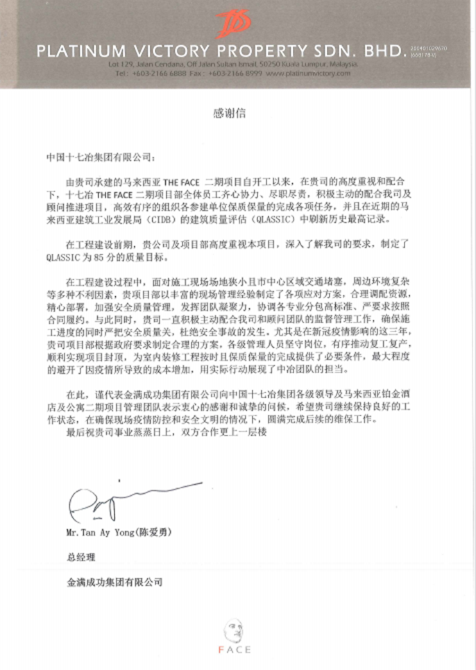 马来西亚THE FACE铂金酒店项目业主向十七冶致感谢信