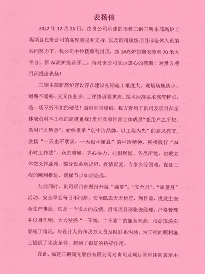 12月25日,中国十七冶集团收到福建三钢闽光股份有限公司签发的表扬信,对冶金工程技术分公司福建三钢三明本部高炉工程项目部在项目新1#2#高炉建设中所展现的攻坚克难、力保节点的担当精神以及取得的突出业绩致以衷心的感谢。