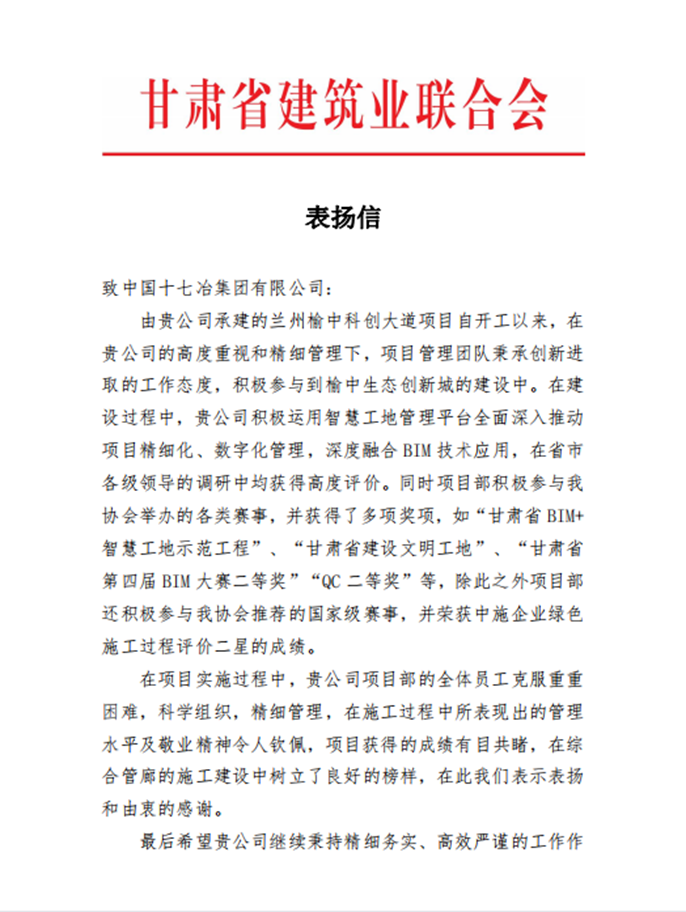 12月30日,甘肃省建筑业联合会致信中国十七冶,对公路分公司榆中科创大道项目积极运用智慧工地管理平台,全面深入推动项目精细化、数字化管理,深度融合BIM技术应用给予高度赞扬。