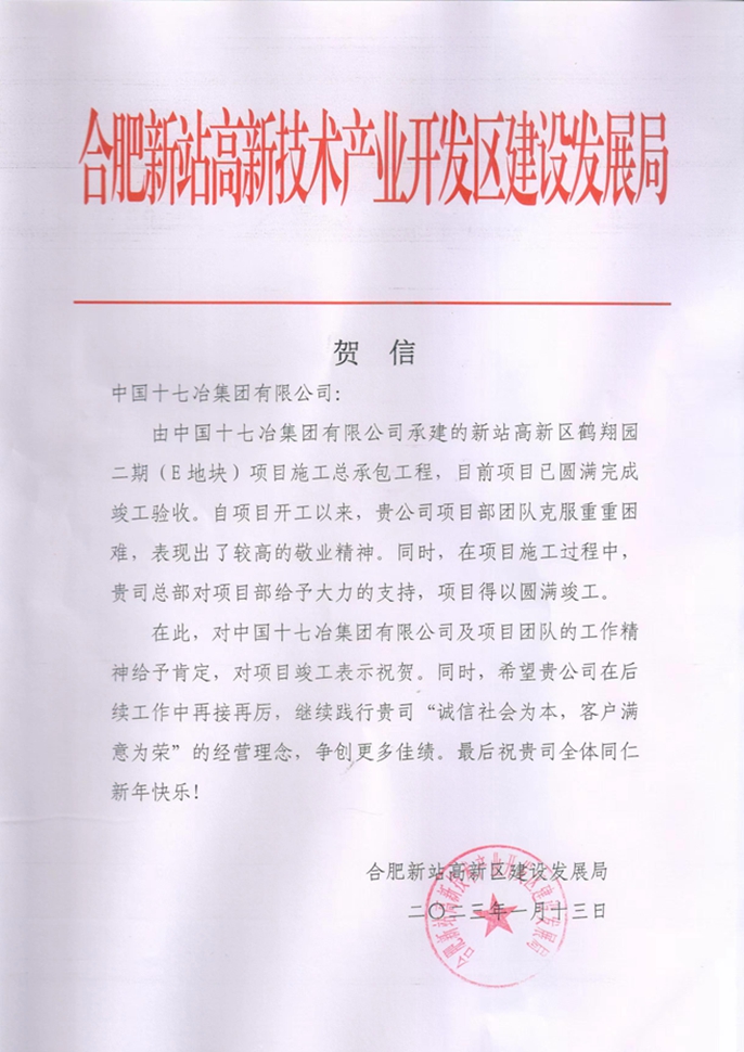 1月13日,合肥新站高新技术产业开发区建设发展局向中国十七冶集团致贺信,对城建分公司承建的合肥新站高新区鹤翔园二期(E地块)项目施工总承包工程圆满完成竣工验收表示祝贺。