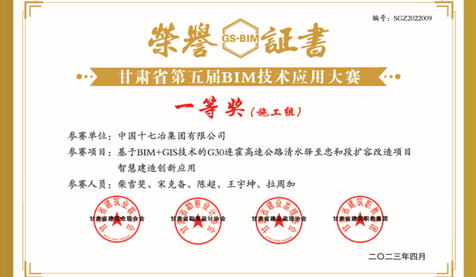 “基于BIM+GIS技术的G30连霍高速公路清水驿至忠和段扩容改造项目智慧建造创新应用”成果荣获施工组一等奖,“平凉市中医医院(中西医结合医院)建设项目BIM技术应用”成果荣获施工组二等奖,“BIM技术在兰州新区瑞岭学府移民安置项目中设计、施工阶段的应用”成果荣获综合组二等奖。