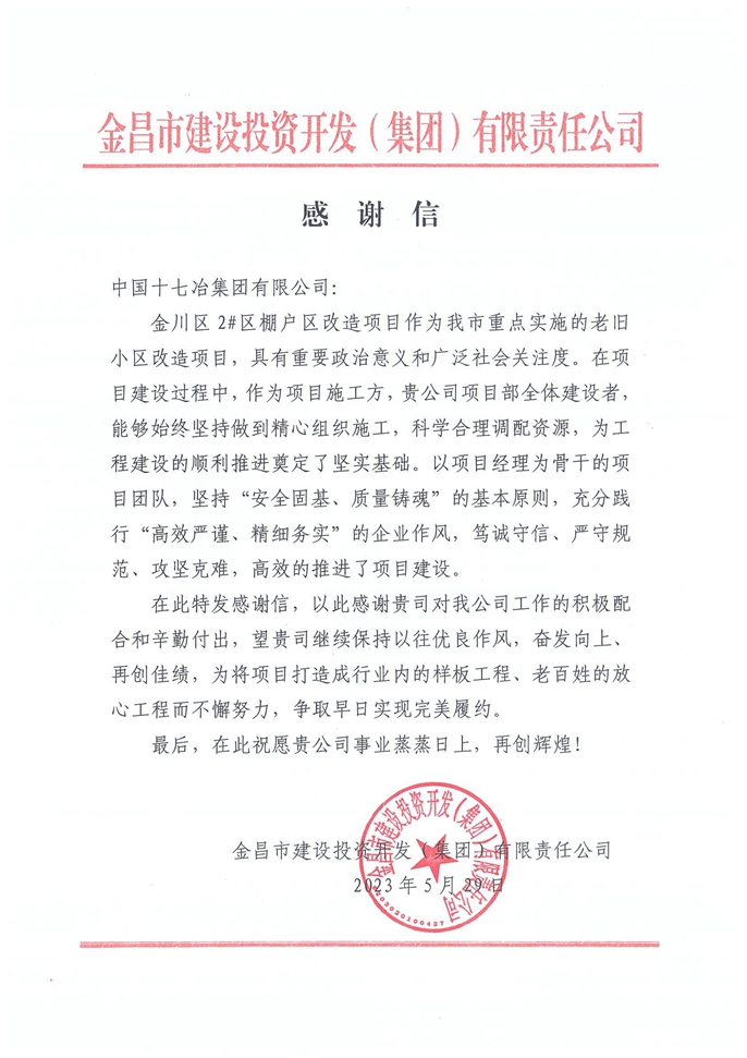 5月29日,金昌市建设投资开发(集团)有限公司向中国十七冶集团致感谢信,就项目高效推进予以充分肯定。